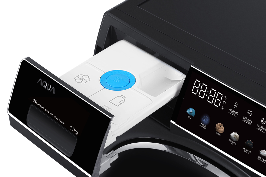 Công nghệ Smart Dosing: Chỉ cần đổ đầy nước giặt và nước xả vào ngăn chứa 1 lần, máy giặt Aqua Inverter 11 kg này sẽ tự động phân bổ chất giặt tẩy đó phù hợp với khối lượng quần áo trong nhiều lần giặt sau đó. Vì thế, tiết kiệm thời gian thao tác và bảo vệ da tay cho người dùng tốt hơn.