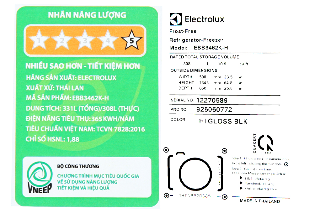 Electrolux Inverter EBB3462K-H sở hữu dung tích 308 lít với ngăn đá 85 lít và ngăn lạnh 223 lít, phù hợp cho những gia đình đông thành viên từ 3 - 4 người, hoặc những gia đình ít thành viên nhưng lại có nhu cầu dự trữ nhiều thực phẩm.