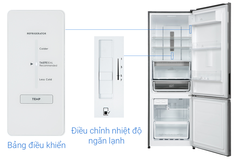 - Dung tích ngăn lạnh 250 lít, được thiết kế gồm có 2 kệ, 1 ngăn rau củ quả và 1 ngăn đông mềm. Bên cánh cửa tủ được thiết kế thêm 1 khay đựng trứng và 2 khay đựng đồ uống phía dưới.