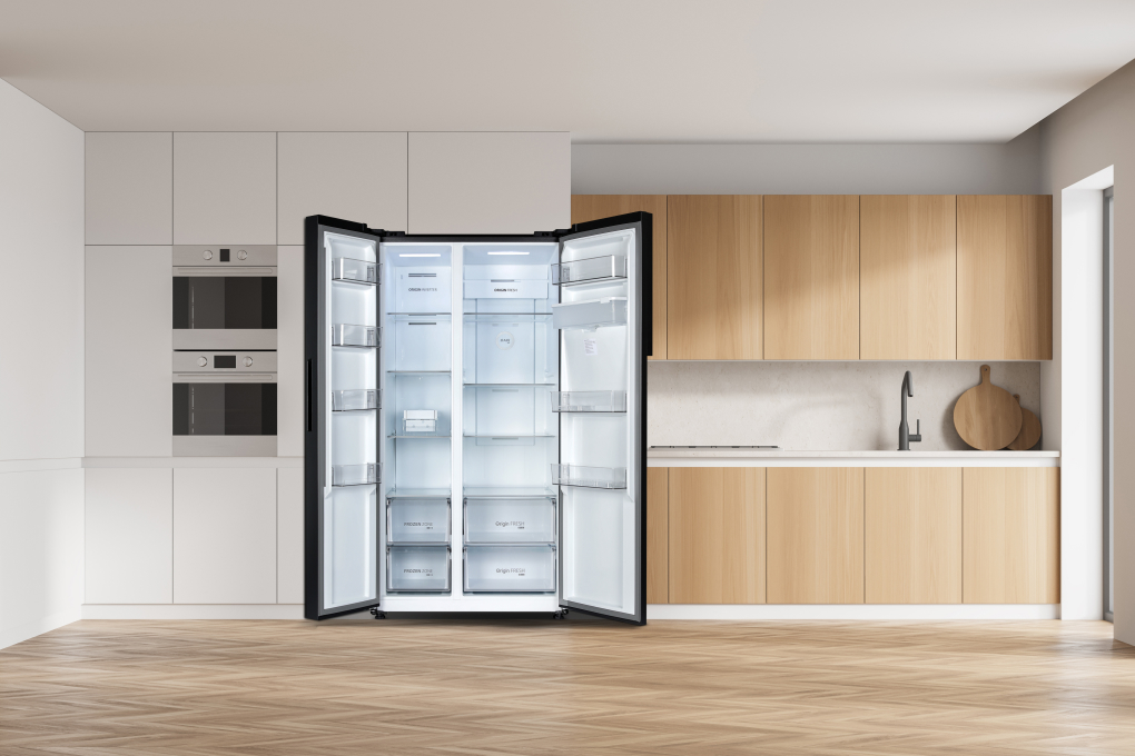 - Thiết kế cửa tủ thông minh: Hỗ trợ người dùng có thể kéo ngăn chứa ra hoàn toàn khi mở cửa tủ 90 độ, thuận tiện cho việc lấy và cho vào thực phẩm bên trong tủ.